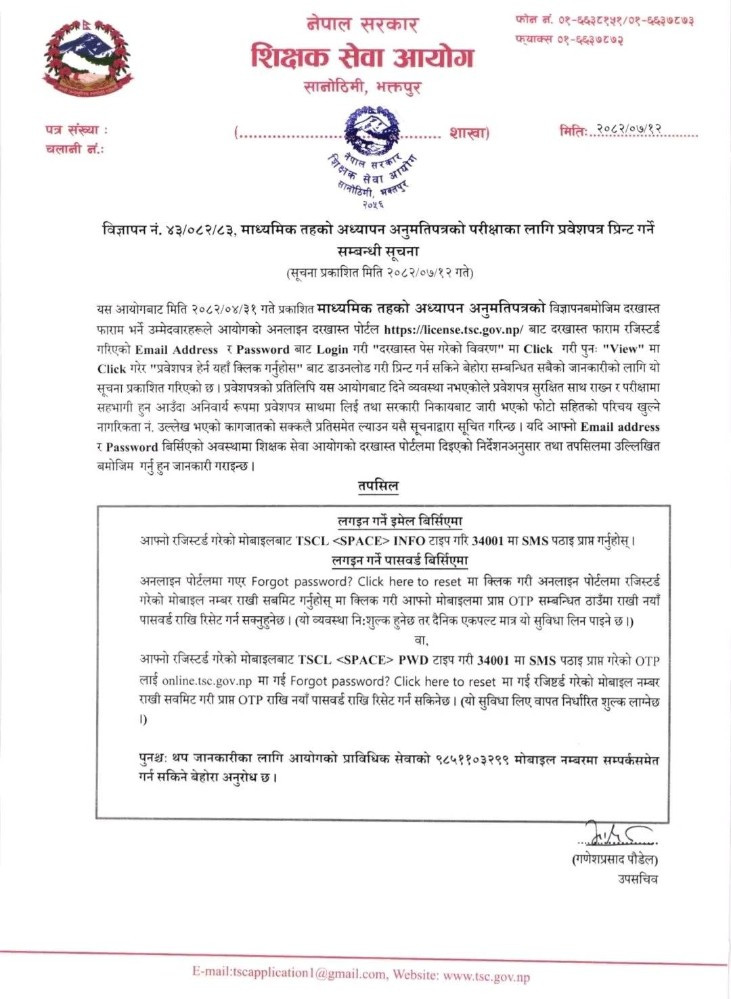 मिति २०८२ साल कार्तिक २२ गते दिउँसो १.०० बजे संचालन हुने माध्यमिक तहको अध्यापन अनुमतिपत्रको परीक्षाका लागि प्रवेशपत्र प्रिन्ट गर्नेसम्बन्धी सूचना
